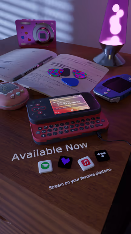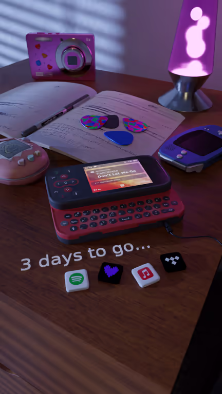 A band named "Arcade Riot" was releasing a song called "Don't Let Me Go" and wanted an album artwork along some videos and social media posts. Their initial idea was that they need a Y2K vibe featuring a flip phone with the track name. After a very short while this idea was developed which you can see in the images. A bedside table with the phone to which earphones are connected, along with other stuff like a GBA, pocket camera, a notebook with lyrics scribbled on (original artists work), a lava lamp, tamagotchi, guitar picks etc. to give that Y2K vibe to the scene.